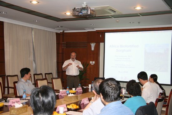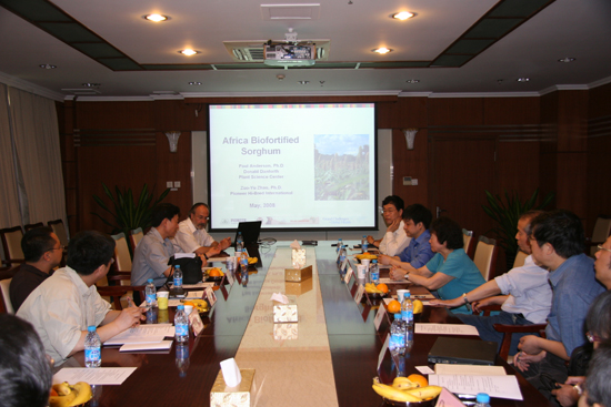 林敏所长首先在会上致辞,对Paul Anderson博士一行的来访表示欢迎,并向客人简要介绍了生物所的研究情况。五位专家做了报告,其中Paul Anderson博士介绍了丹佛植物科学中心及非洲高粱营养改良项目的进展情况;赵佐宇博士和邹继军博士分别就高粱转化技术研究和先锋公司开发的高通量转基因评价系统做了报告;生物所张春义研究员介绍了生物所在植酸酶、抗虫、抗旱、抗除草剂和富含维生素的转基因玉米研究及中国生物强化项目中高类胡萝卜素甘薯品种选育的主要进展情况;作物科学所黎裕研究员介绍了国家种质库和玉米资源研究的情况。