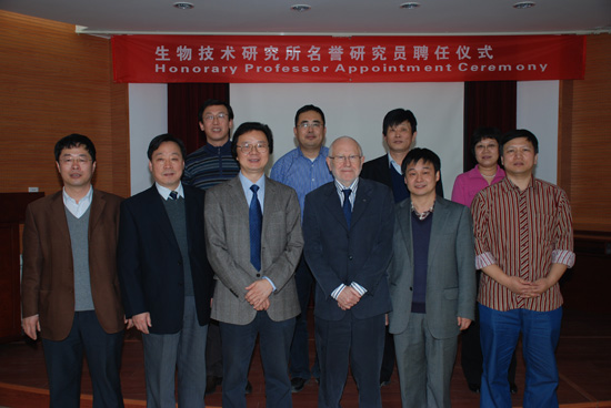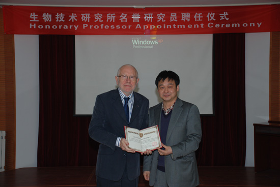 2011年2月23日下午,聘任英国皇家学会会员Ray Dixon教授为生物技术研究所名誉研究员仪式在所二楼会议室举行。唐华俊副院长出席了仪式,仪式由张春义副所长主持,院国际合作局申和平副局长、金轲处长,我所林敏所长、张洪岭副所长、孙丽萍副书记及相关专家和研究生代表参加了聘任仪式。 唐华俊副院长代表中国农科院对Ray Dixon教授的来访表示欢迎,简要介绍了我院的基本情况以及我院近年来在科研和国际合作领域的快速发展,希望今后双方进一步加强联系,在学术交流、科研合作等方面建立长期、紧密的合作关系,推动研究所科技创新、人才培养等工作。张春义副所长介绍了Ray Dixon博士的教育背景、任职情况和主要学术成就,林敏所长向Ray Dixon教授颁发了名誉研究员聘书。Ray Dixon教授对生物所聘任他为名誉研究员表示感谢,并表示希望不断加强交流,建立双方实验室合作机制,努力提供更多的交流机会与平台。 Ray Dixon教授是国际上最早开展生物固氮分子生物学研究的科学家之一,在生物固氮领域做出了杰出的贡献。目前担任英国John Innes Center 教授和微生物系主任。