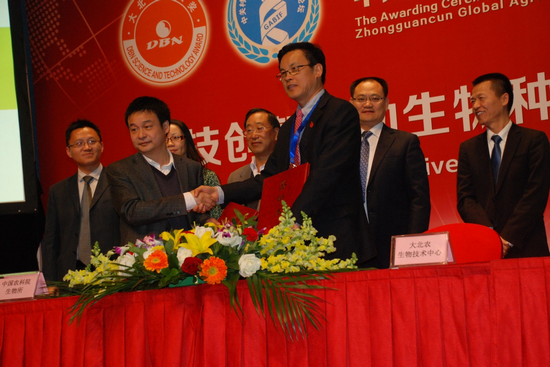 11月14日,我所与北京大北农科技股份有限公司在国家会议中心签署战略合作协议。林敏所长和大北农生物技术中心总经理吕玉平代表合作双方签字,生物所郭三堆研究员、陆伟副研究员和科研处副处长宋斌出席签约仪式。