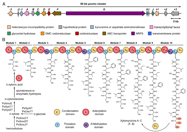 Xylomyrocins, a unique group of nonribosomal peptide secondary metabolites, werediscovered inParamyrotheciumandColletotrichumspp. fungi by employing a combina-tion of high-resolution tandem mass spectrometry (HRMS/MS)–based chemometrics,comparativegenomemining,genedisruption,stableisotopefeeding,andchemicalcomplementation techniques. These polyol cyclodepsipeptides all feature an unprece-dentedD-xylonic acid moiety as part of their macrocyclic scaffold. This biosynthon isderived fromD-xylose supplied by xylooligosaccharide catabolic enzymes encoded in thexylomyrocinbiosyntheticgenecluster,revealinganovellinkbetweencarbohydratecatabolism and nonribosomal peptide biosynthesis. Xylomyrocins from different fungalisolates differ in the number and nature of their amino acid building blocks that areneverthelessincorporatedbyorthologousnonribosomalpeptidesynthetase(NRPS)enzymes. Another source of structural diversity is the variable choice of the nucleophilefor intramolecular macrocyclic ester formation during xylomyrocin chain termination.This nucleophile is selected from the multiple available alcohol functionalities of thepolyol moiety, revealing a surprising polyspecificity for the NRPS terminal condensa-tion domain. Some xylomyrocin congeners also featureN-methylated amino acid resi-duesinpositionswherethecorrespondingNRPSmodules lackN-methyltransferase(M) domains, providing a rare example of promiscuous methylation in the context ofan NRPS with an otherwise canonical, collinear biosynthetic program.
