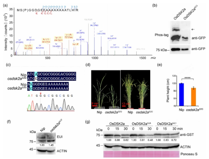 Plants grow rapidly for maximal production under optimal conditions; however, they adopt a slower growth strategy to maintain survival when facing environmental stresses. As salt stress restricts crop architecture and grain yield, identifying genetic variations associated with growth and yield responses to salinity is critical for breeding optimal crop varieties. OsDSK2a is a pivotal modulator of plant growth and salt tolerance via the modulation of gibberellic acid (GA) metabolism; however, its regulation remains unclear. Here, we showed that OsDSK2a can be phosphorylated at the second amino acid (S2) to maintain its stability. The gene-edited mutant osdsk2aS2G showed decreased plant height and enhanced salt tolerance. SnRK1A modulated OsDSK2a-S2 phosphorylation and played a substantial role in GA metabolism. Genetic analysis indicated that SnRK1A functions upstream of OsDSK2a and affects plant growth and salt tolerance. Moreover, SnRK1A activity was suppressed under salt stress, resulting in decreased phosphorylation and abundance of OsDSK2a. Thus, SnRK1A preserves the stability of OsDSK2a to maintain plant growth under normal conditions, and reduces the abundance of OsDSK2a to limit growth under salt stress. Haplotype analysis using 3 K-RG data identified a natural variation in OsDSK2a-S2. The allele of OsDSK2a-G downregulates plant height and improves salt-inhibited grain yield. Thus, our findings revealed a new mechanism for OsDSK2a stability and provided a valuable target for crop breeding to overcome yield limitations under salinity stress.