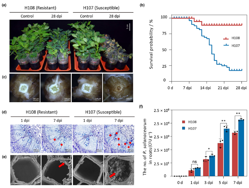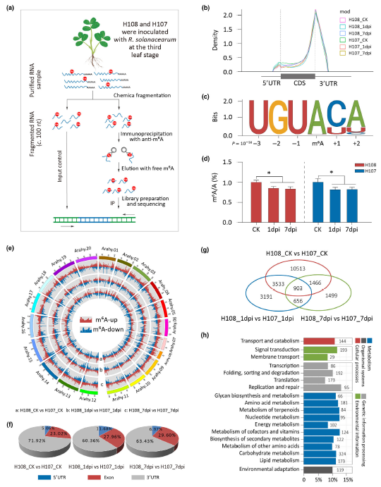 N6-methyladenosine (m6A) is the most abundant mRNA modification in eukaryotes and is an important regulator of gene expression as well as many other critical biological processes. However, the characteristics and functions of m6A in peanut (Arachis hypogea L.) resistance to bacterial wilt (BW) remain unknown. Here, we analyzed the dynamic of m6A during infection of resistant (H108) and susceptible (H107) peanut accessions with Ralstonia solanacearum (R. solanacearum), the causative