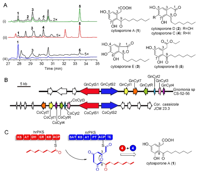 Polyketides with the isochroman-3-one pharmacophore are rare among fungal natural products as their biosynthesis requires an unorthodox S-type aromatic ring cyclization. Genome mining uncovered a conserved gene cluster in select leotiomycetous fungi that encodes the biosynthesis of cytosporones, including isochroman-3-one congeners. Combinatorial biosynthesis in total biosynthetic and biocatalytic formats in Saccharomyces cerevisiae and in vitro reconstitution of key reactions with purified enzymes revealed how cytosporone structural and bioactivity diversity is generated. The S-type acyl dihydroxyphenylacetic acid (ADA) core of cytosporones is assembled by a collaborating polyketide synthase pair. Thioesterase domain-catalyzed transesterification releases ADA esters, some of which are known Nur77 modulators. Alternatively, hydrolytic release allows C6 hydroxylation by a flavin-dependent monooxygenase, yielding a trihydroxybenzene moiety. Reduction of the C9 carbonyl by a short chain dehydrogenase/reductase initiates isochroman-3-one formation, affording cytosporones with cytotoxic and antimicrobial activity. Enoyl di- or trihydroxyphenylacetic acids are generated as shunt products, while isocroman-3,4-diones are formed by autoxidation. The cytosporone pathway offers novel polyketide biosynthetic enzymes for combinatorial synthetic biology to advance the production of “unnatural” natural products for drug discovery.