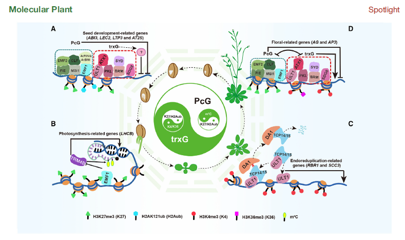 Polycomb (PcG) and trithorax (trxG) are two groups of conserved epigenetic complexes that maintain active and repressive states of target genes by altering their chromatin states to regulate plant development and stress responses. In the conventional view, PcG and trxG proteins often function antagonistically in transcriptional gene regulation, based on the observation that mutations in trxG and PcG genes can counteract each other’s activity, whereas mutations of genes within each group have synergistic effects (Pu and Sung, 2015). Despite this general tendency, a