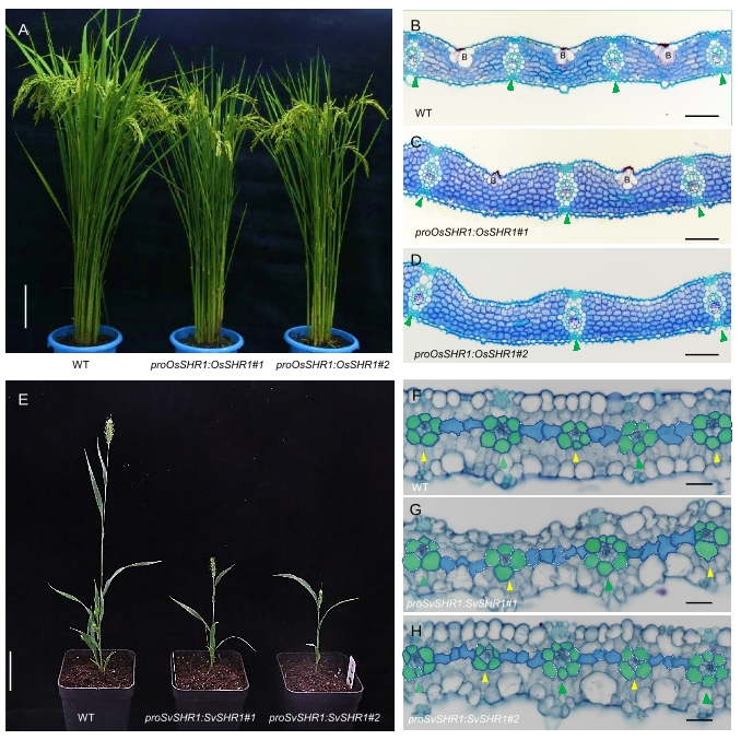 C; and C, grasses directly and indirectly provide the vast majority of calories to the human diet, yet our understanding of themolecular mechanisms driving photosynthetic productivity in grasses is largely unexplored. Ground meristem cells divide toform mesophyll or vascular initial cels early in leaf development in C, and C, grasses.Here we dehine a genetic circuit composedof SHORT ROOT (SHR),INDETERMINATE DOMAIN (IDD), and PIN-FORMED (PIN) family members that specifes vascularidentify and ground cell proliferation in leaves of both C; and C grasses. Ectopic expression and loss-of-function mutant stud'jes of SHR paralogs in the C plant 0ryza sativa (rice) and the C, plant Setaria viridis (green millet) revealed the roles of thesegenes in both minor vein formation and ground cell diferentiation. Genetic and in vitro studies further suggested that SHRregulates this process through its interactions with lDD12 and 13. We also revealed direct interactions of these lDD proteinswith a putative regulatory element within the auxin transporter gene PlN5c. Collectively, these fndings indicate that a SHR-IDD regulatory circuit mediates auxin transport by negatively regulating PIN expression to modulate minor vein patterning inthe grasses.