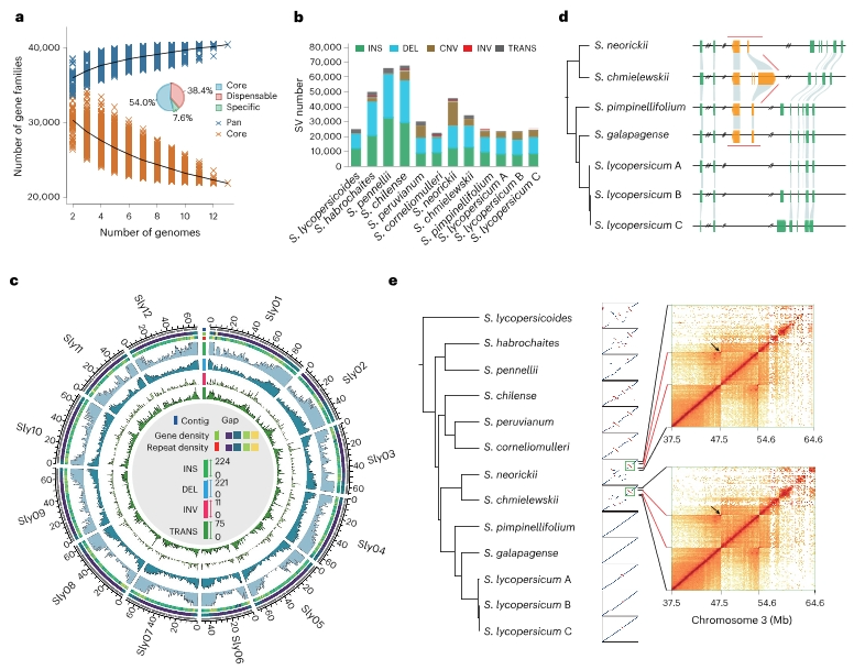 Effective utilization of wild relatives is key to overcoming challenges in genetic improvement of cultivated tomato, which has a narrow genetic basis; however, current efforts to decipher high-quality genomes for tomato wild species are insufficient. Here, we report chromosome-scale tomato genomes from nine wild species and two cultivated accessions, representative of Solanum section Lycopersicon, the tomato clade. Together with two previously released genomes, we elucidate the phylogeny of Lycopersicon and construct a section-wide gene repertoire. We reveal the landscape of structural variants and provide entry to the genomic diversity among tomato wild relatives, enabling the discovery of a wild tomato gene with the potential to increase yields of modern cultivated tomatoes. Construction of a graph-based genome enables structural-variant-based genome-wide association studies, identifying numerous signals associated with tomato flavor-related traits and fruit metabolites. The tomato super-pangenome resources will expedite biological studies and breeding of this globally important crop. A tomato super-pangenome constructed using chromosome-scale genomes of nine wild species and two cultivated accessions highlights genomic diversity and structural variation across wild and cultivated tomatoes.
