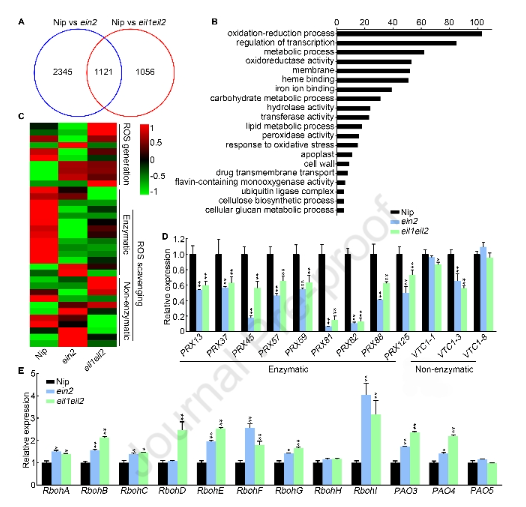 Successful emergence from the soil is a prerequisite for the survival of seed plants in naturaenvironment. In rice, coleoptile elongation facilitates seedling emergence and establishment,andethylene plays an important role in this process. However, the regulatory mechanism underlyingremains largely unclear, Here, we report that ethylene promotes cell elongation and inhibits cellexpansion in rice coleoptiles, resulting in longer and thinner coleoptile to facilitate seedlingemergence from the soil. Transcriptome analysis showed that genes related to reactive oxygenspecies (ROS) generation were up-regulated and genes involved in ROS scavenging weredown-regulated in the coleoptile of ethylene signaling mutants. Further investigations showed thatsoil coverage promotes the accumulation of ETHYLENE INSENSITIVE 3-LIKE 1(OsEIL1) andOsEIL2 in the upper region of coleoptile, and both OsEIL1 and OsElL2 could directly bind to thepromoters of GDP-mannose pyrophosphorylase (VTCl) OsVTCI-3, peroxidase (PRX) genesOsPRX37, OsPRX81,OsPRX82, and OsPRX88 to activate their expression, leading to increasedascorbic acid (AsA) content and peroxidase activity and decreased ROS accumulation in the upperregion of coleoptile. Disrupting ROS accumulation promotes coleoptile growth and seedlingemergence from soil. Thus, our findings deepen our understanding of the role of ethylene andROS in controlling coleoptile growth, and this knowledge can be used by breeders to cultivate ricevarieties suitable for direct-seeding.