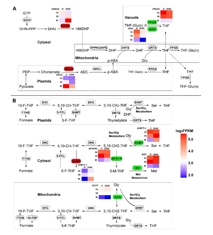 Previously, the complexity of folate accumulation in the early stages of maize kernel development has been reported, but the mechanisms of folate accumulation are unclear. Two maize inbred lines, DAN3130 and JI63, with different patterns of folate accumulation and different total folate contents in mature kernels were used to investigate the transcriptional regulation of folate metabolism during late stages of kernel formation by comparative transcriptome analysis. The folate accumulation during DAP 24 to mature kernels could be controlled by circumjacent pathways of folate biosynthesis, such as pyruvate metabolism, glutamate metabolism, and serine/glycine metab-olism. In addition, the folate variation between these two inbred lines was related to those genes among folate metabolism, such as genes in the pteridine branch, para-aminobenzoate branch, ser-ine/tetrahydrofolate (THF)/5-methyltetrahydrofolate cycle, and the conversion of THF monogluta-mate to THF polyglutamate. The findings provided insight into folate accumulation mechanisms during maize kernel formation to promote folate biofortification.
