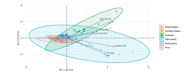 Pulses are good natural sources of micronutrients. In this study, the concentration and composition of folates in seeds of 102 pulse varieties newly-developed in China, including mung beans, adzuki beans, cowpeas, faba beans, peas, and common beans, were analysed. The total folate content ranged from 21 to 278 4g/100 g dry