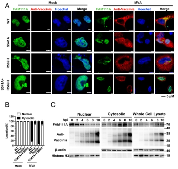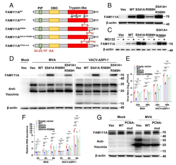Zoonotic poxviruses such as mpox virus (MPXV) continue to threaten public healthsafety since the eradication of smallpox. Vaccinia virus (VACV), the prototypic poxvirusused as the vaccine strain for smallpox eradication, is the best-characterized member ofthe poxvirus family. VACV encodes a serine protease inhibitor 1 (SPI-l) conserved in allorthopoxviruses, which has been recognized as a host range factor for modified VACVAnkara (MVA), an approved smallpox vaccine and a promising vaccine vector, FAM111A(family with sequence similarity lll member A), a nuclear protein that regulates hostDNA replication, was shown to restrict the replication ofa VACV SPI-I deletion mutant(VACV-ASPI-1) in human cells. Nevertheless, the detailed antiviral mechanisms ofFAM111A were unresolved. Here, we show that FAM111A is a potent restriction factorfor VACV-ASPI-1 and MVA. Deletion of FAM111A rescued the replication of MVAand VACV-ASPI-1 and overexpression of FAM111A significantly reduced viral DNAreplication and virus titers but did not affect viral early gene expression. The antiviraleffect of FAM111A necessitated its trypsin-like protease domain and DNA-bindingdomain but not the PCNA-interacting motif. We further identified that FAM111Atranslocated into the cytoplasm upon VACV infection by degrading the nuclear porecomplex via its protease activity, interacted with VACV DNA-binding protein I3, andpromoted I3 degradation through autophagy. Moreover, SPI-1 from VACV MPXV orlumpy skin disease virus was able to antagonize FAM111A by prohibiting its nuclearexport. Our findings reveal the detailed mechanism by which FAM111A inhibits VACVand provide explanations for the immune evasive function ofVACV SPI-l.
