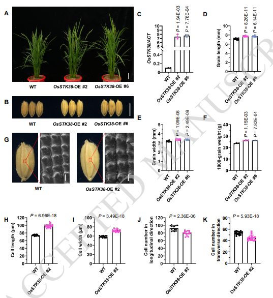 Grain size and weight are crucial yield-related traits in rice (Oryza sativa). Although certain key genes associated with rice grain size and weight have been successfully cloned, the molecular mechanisms underlying grain size and weight regulation remain elusive. Here, we identified a molecular pathway regulating grain size and weight in rice involving the MPS ONE BINDER KINASE ACTIVATOR-LIKE 1A–SERINE/THREONINE-PROTEIN KINASE 38–CYCLIN C (OsMOB1A–OsSTK38–OsCycC) module. OsSTK38 is a nuclear Dbf2-related kinase that positively regulates grain size and weight by coordinating cell proliferation and expansion in the spikelet hull. OsMOB1A interacts with and enhances the