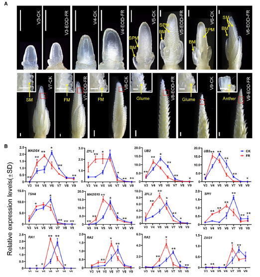 maize inflorescence development in response to high-density planting remain poorly understood. In this study, we showed that shade-mimicking treatments cause precocious development of the tassels and ears. Comparative transcriptome profiling analyses