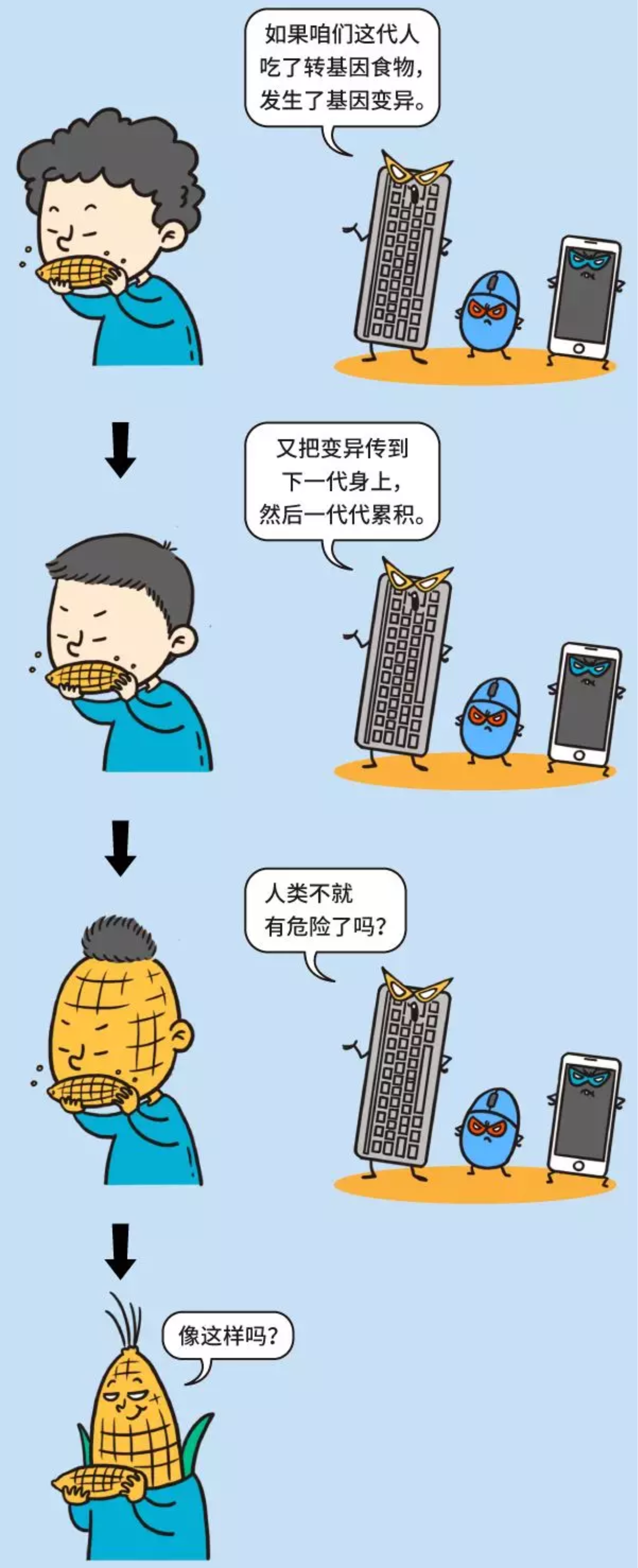 问出这样问题的人,其实是在担心,“转基因食物会不会影响改变人的基因”。他们认为,如果食物里转进了人类从未吃过的新基因,万一我们的胃不认识它,让它跑到我的基因里面,把我的基因也弄得变异了,那不是就完蛋了?