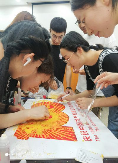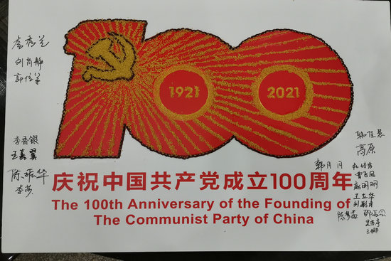 三个研究生党支部党员以实验种子为材料,用黄色的小米制作了党徽、数字“1921”“2021”和56根光芒线,用红豆勾勒出党徽和数字“100”的形状轮廓,历时2个多小时,制作完成了“中国共产党成立100周年庆?;疃晔丁?,生动展现中国共产党团结带领中国人民不忘初心、牢记使命、艰苦奋斗的百年光辉历程,深切表达了对党的忠诚、热爱和祝福之情。