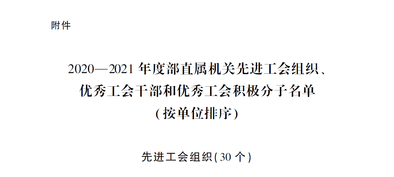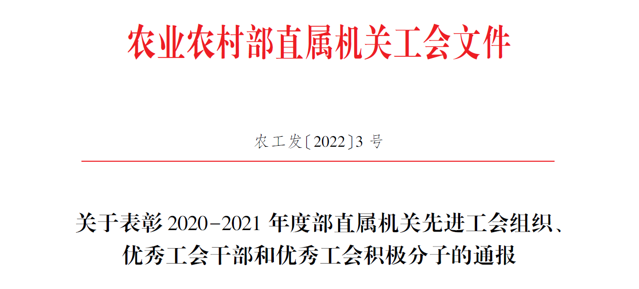 近日,农业农村部直属机关党委联合部工会组织开展了2020-2021年度部直属机关先进工会组织、优秀工会干部和优秀工会积极分子评选表彰工作。我所工会荣获2020-2021年度部直属机关先进工会组织荣誉称号。