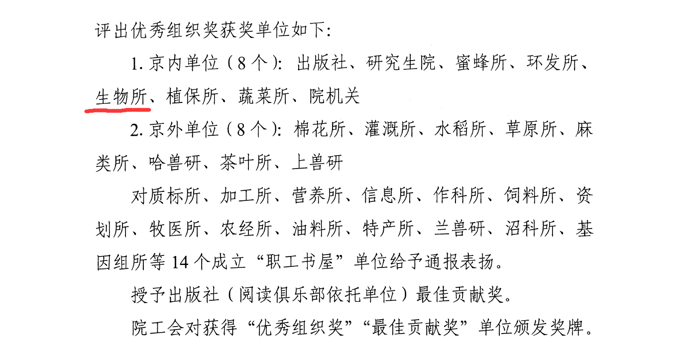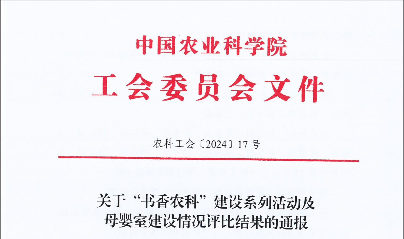 近日,为贯彻落实党的二十大关于“深化全民阅读活动”的部署要求,在第29个“世界读书日”临之际,院工会对开展的“凝心铸魂跟党走团结奋斗新征程”书香农科建设系列活动进行了评比,在此次评比中我所工会获得院表彰,荣获优秀组织奖;同时在京区各单位“母婴室”建设工作的现场考核评价中获得优秀。
