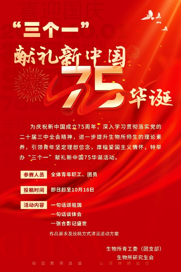 近日,生物所青工委(团支部)、研究生会联合举办了“三个一”献礼新中国75华诞活动,旨在激发全所青年的爱国热情,深入学习贯彻落实党的二十届三中全会精神,将学习成果转为工作动力,更好的服务研究所各项事业。全所青年科研人员、研究生积极参加活动,收到作品60余份。