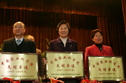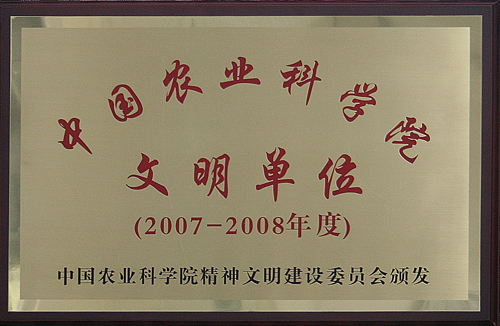在所领导班子的带领和全体职工共同努力下,我所被授予“2007-2008年度中国农业科学院文明单位”荣誉称号,陈茹梅同志被授予“2007-2008年度中国农业科学院文明职工”荣誉称号,并在1月5日召开的中国农业科学院2009年工作会议开幕式上受到表彰。