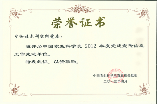 近日,院直属机关党委对2012年度党建宣传信息工作先进单位和先进个人进行了表彰,我所党建信息报送发布数量位列全院第三,被评为中国农业科学院2012年度党建宣传信息工作先进单位,于大伟被评为优秀信息员。