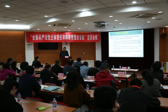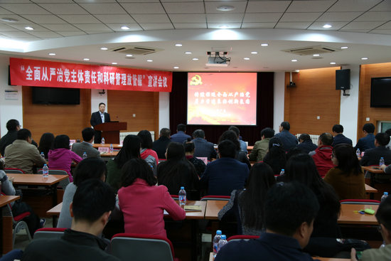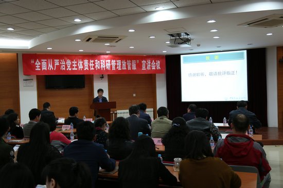 贾广东以“持续推进全面从严治党,着力营造良好创新氛围”为主题,从“落实主体责任、加强党的领导,严肃党内政治生活、加强党的建设,严明党的纪律、营造风清气正的科技创新环境”三个方面,深入解读了《准则》、《条例》的主要精神与核心理念,并对研究所贯彻落实工作提出明确要求。要切实履行领导班子集体责任、所长书记第一责任和班子成员“一岗双责”;要加强和规范党内政治生活,把学习党章党规和习近平总书记系列重要讲话作为一项长期的政治任务,推进“两学一做”学习教育的常态化制度化;要严明党的纪律,严格落实中央八项规定精神,努力营造风清气正的科技创新环境。