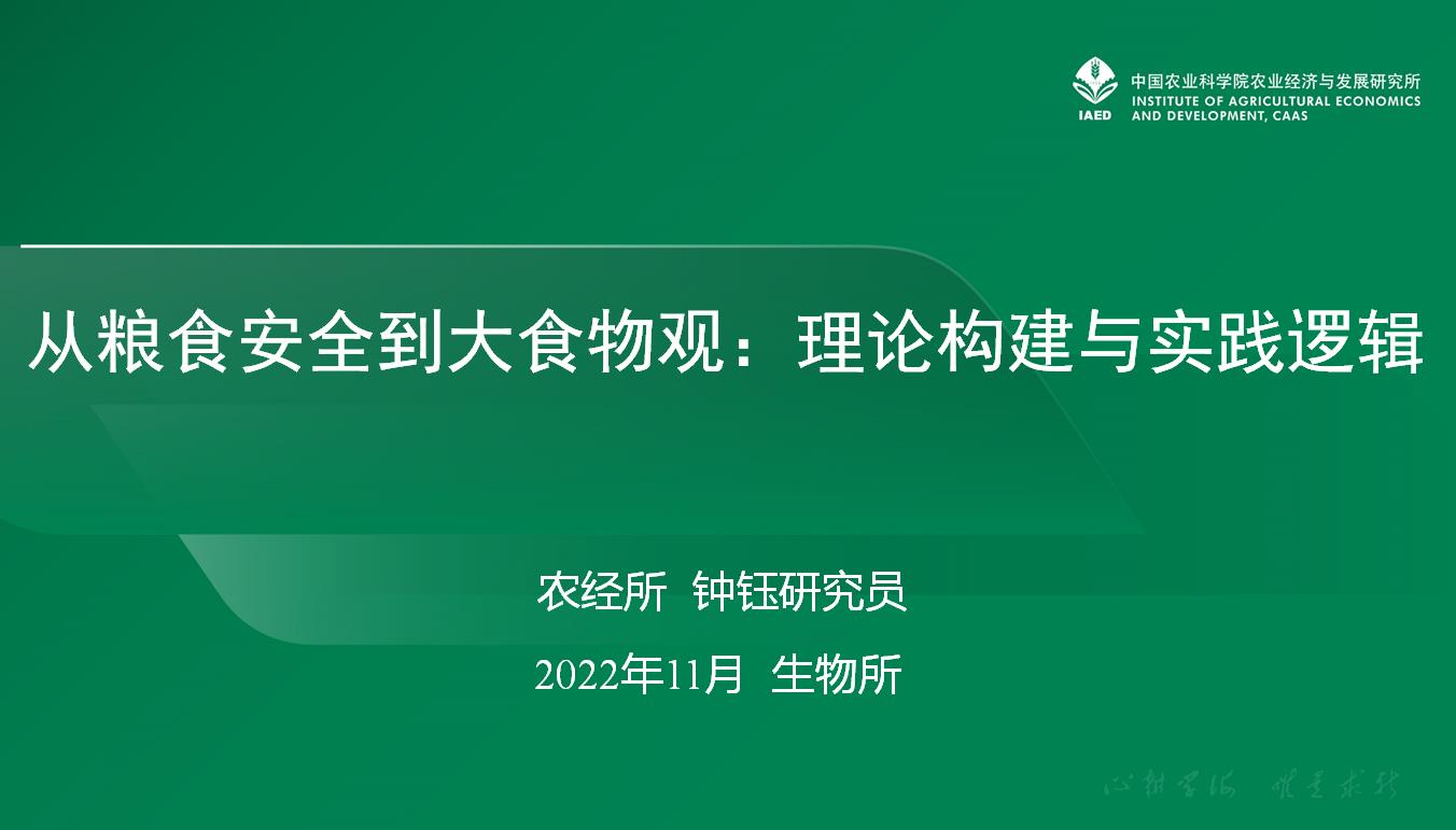11月8日,生物所青年理论学习小组联合“未来农业”青年科技论坛开展科技赋能“大食物观”系列谈,第一期活动邀请到中国农科院农经所钟钰研究员作了“从粮食安全到大食物观:理论构建与实践逻辑”为题的精彩报告,从宏观角度阐释了“大食物观”下的大食物内涵特征与实施重点,为科研人员打开了全新视角。