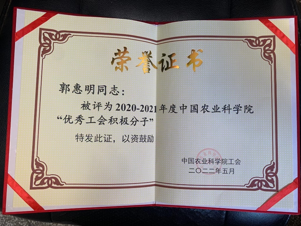 近日,院工会印发《关于表彰2020-2021年度部中国农业科学院先进工会组织、优秀工会干部和优秀工会积极分子的决定》。生物技术研究所工会荣获先进工会组织,郭惠明同志获评优秀工会积极分子荣誉称号。