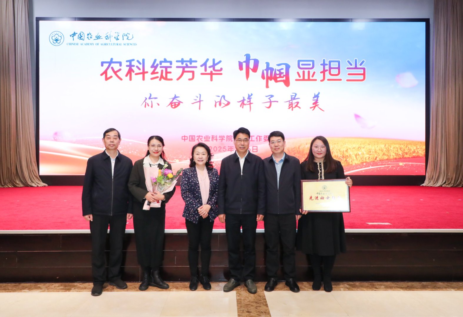 3月6日上午,中国农业科学院隆重召开了“农科绽芳华 巾帼显担当——你奋斗的样子最美”纪念“三八”国际妇女节115周年主题活动。生物所妇女工作获得表彰,所妇委会荣获“先进妇女组织”,蔡晶晶家庭荣获“五号文明家庭”,王登山荣获“妇女之友”,为生物所赢得了荣誉。