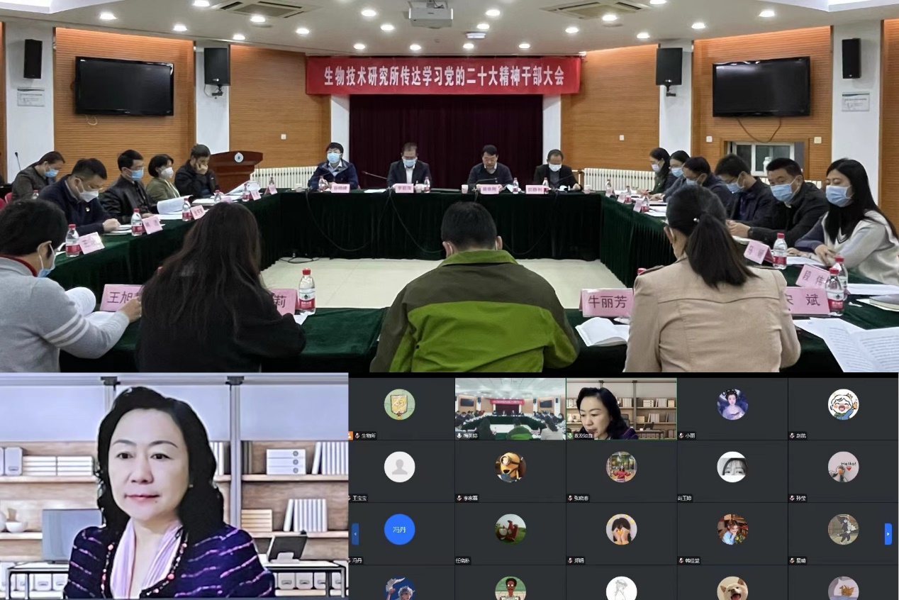 10月28日,生物所召开干部大会,传达学习党的二十大精神,以及农业农村部、中国农科院干部大会精神,原原本本研读党的二十大报告,部署安排学习宣传贯彻工作。李新海所长交流学习体会,并对推进研究所下一步工作提出明确要求?;嵋橛衫詈炜凳榧侵鞒?。