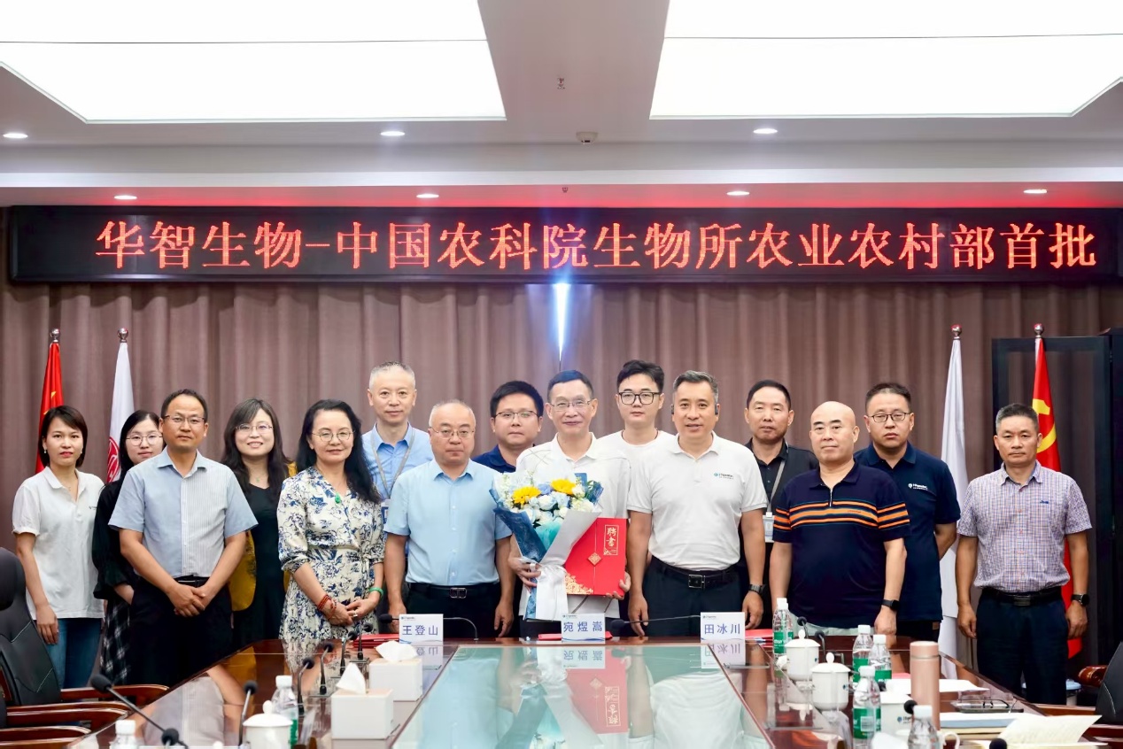 9月2日,中国农业科学院生物技术研究所与华智生物技术有限公司在长沙华智生物总部举行农业农村部首批“科技副总”聘任仪式暨工作交流会。生物所宛煜嵩研究员被聘任为华智生物“科技副总”。王登山所长、华智生物董事长兼总裁田冰川、副总裁王朝晖、成果转化处张宇宏副处长,资深顾问王琴芳等出席会议。