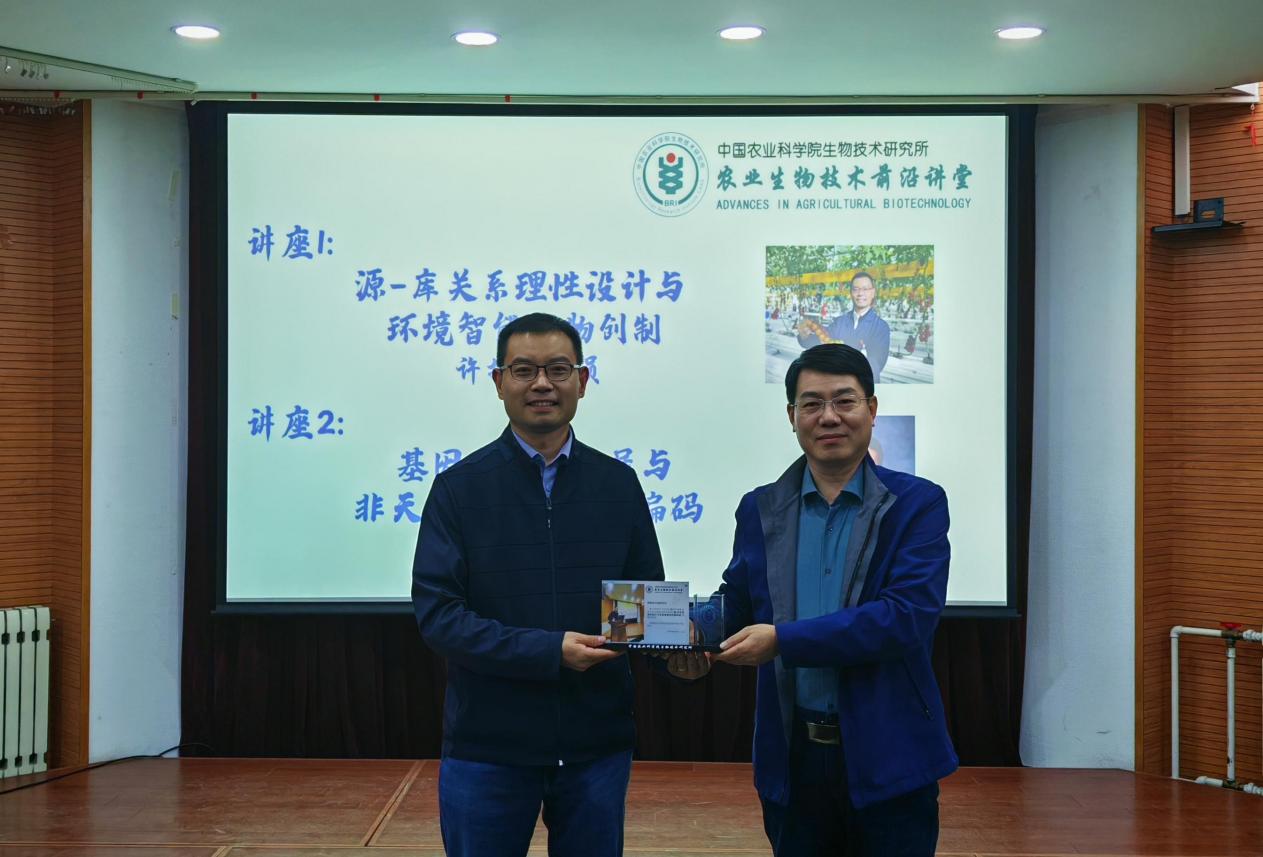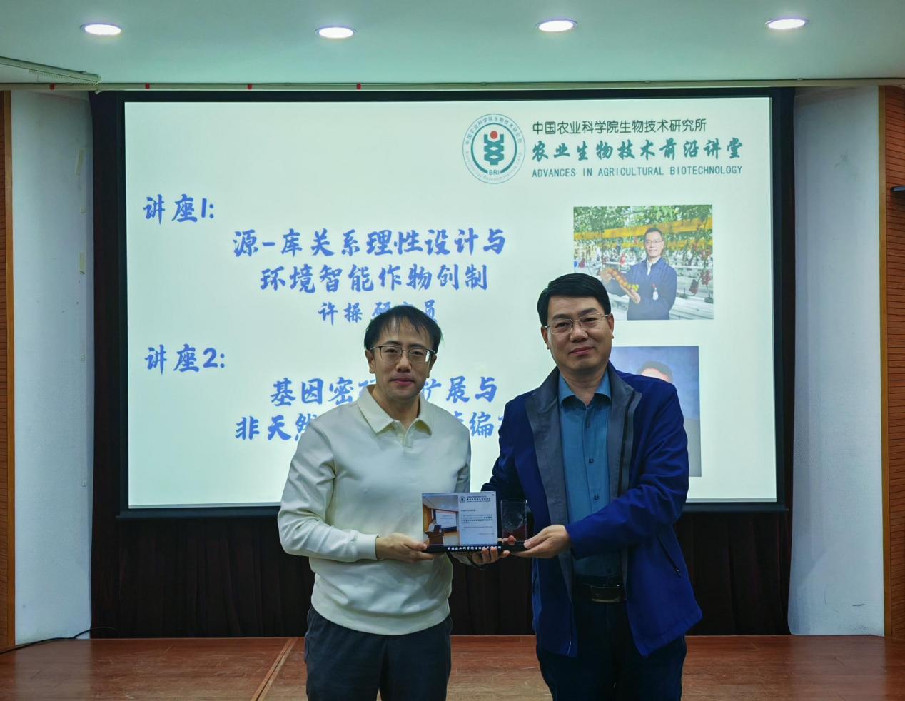 1月8日,生物技术研究所举办了2025年第1期农业生物技术前沿讲堂,邀请中国科学院遗传发育所许操研究员与北京大学博雅特聘教授刘涛教授分别以“源-库关系理性设计与环境智能作物创制”和“基因密码子扩展与非天然氨基酸遗传编码”为题做主题报告。