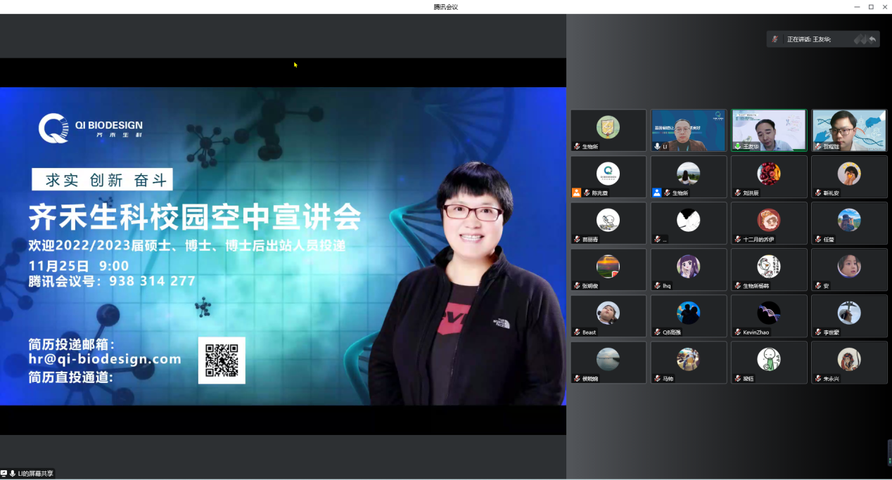 为进一步做好研究生就业工作,加深行业认识,拓宽毕业生就业渠道,缓解疫情期间研究生就业压力,我所邀请齐禾生科生物科技有限公司于11月25日以线上会议形式召开专场招聘会,全所60余名研究生参会。