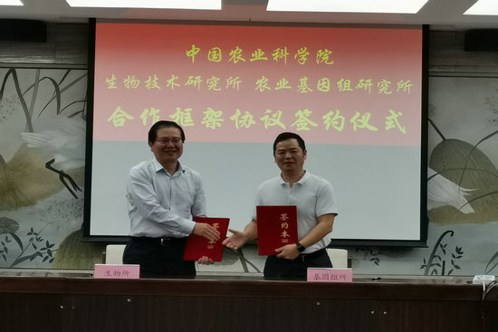 为进一步加强兄弟研究所之间的合作交流,促进一流学科和一流研究所建设,推动实现优势互补、资源共享和人员互通,10月27日,生物所与基因组所在深圳签署合作框架协议。李新海所长和基因组所黄三文所长代表合作双方在协议书上签字。党委书记姜梅林,基因组所党委书记骆建忠出席签约仪式。