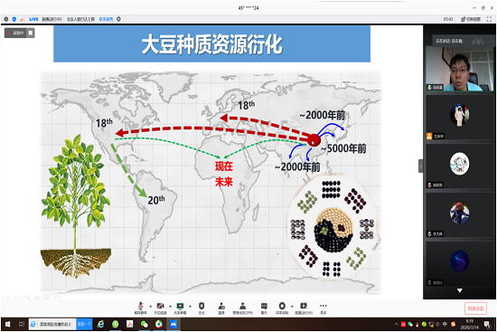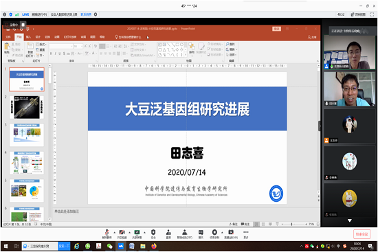 7月14日,由中国农业科学院科技管理局主办、生物技术研究所承办的“未来农业”第六期青年科技讲坛,以网络视频会议的形式举行。本次讲坛邀请中国科学院遗传与发育生物学研究所田志喜研究员以“大豆泛基因组研究进展”为题作学术报告。来自院属各单位及院外高校、科研院所的科研人员、研究生参加了会议,在线人数最高达到会议主会场上限300人,并进行会议直播,体现了科研人员对作物泛基因组学国际前沿的高度关注。