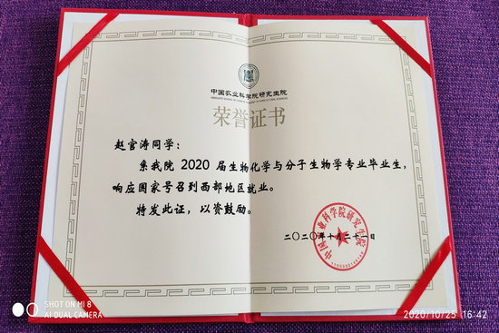 近日,为进一步鼓励和引导毕业生到西部、到基层、到祖国最需要的地方建功立业,研究生院向赴西部基层就业毕业生给予了表彰和奖励。我所2020届毕业生赵官涛同学获得服务西部和基层荣誉证书。