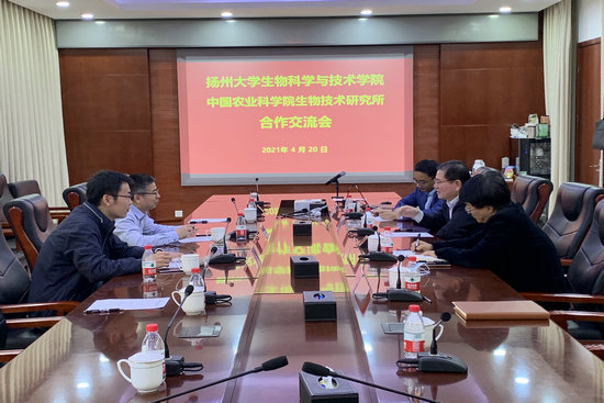 4月20日,扬州大学生物科学与技术学院黄金林院长、高勇主任一行到生物所交流合作。生物所所长李新海,副所长谷晓峰出席会议。