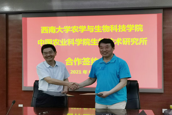 随后,张建奎与路铁刚分别代表西南大学农学院和生物所签订农科教合作人才培养基地共建协议,对本科生实践、研究生联合培养、协同创新研究等方面做了约定,为下一步开展多领域、深层次、全方位合作奠定基础。