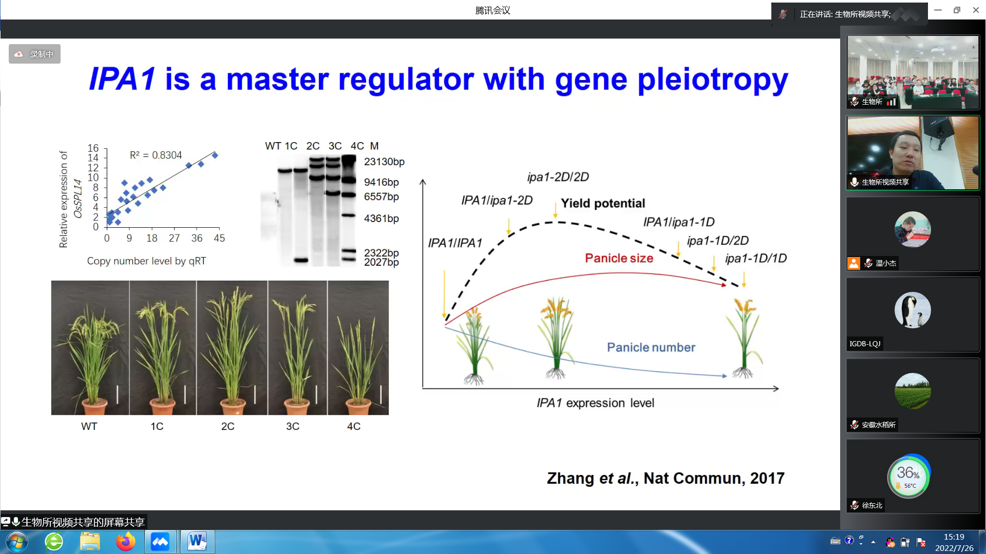 水稻是重要的主粮作物,IPA1是李家洋团队之前鉴定出来的一个典型的多效性基因,可以调控水稻多方面生长发育过程。余泓系统介绍了IPA1协同调控水稻高产、抗病、耐逆等重要性状的分子机理,重点讲解了其所在团队通过编辑IPA1基因的顺式调控区成功解除水稻产量关键要素间负相关性,突破水稻产量瓶颈的最新研究进展,以及异源四倍体野生稻快速从头驯化的育种新策略。