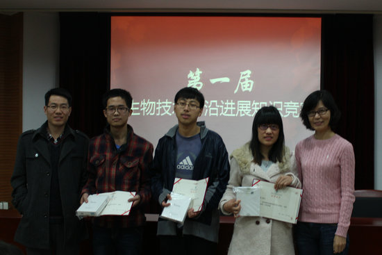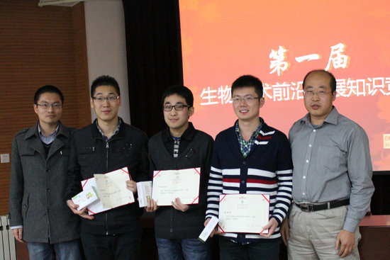 21世纪是生物科学突飞猛进的时代,前沿科学成果和进展日新月异。为了更好的把握科学前沿动态,增加同学们学习专业知识的兴趣和热情,提供一个相互交流学习的平台,第一届“生物技术前沿进展知识竞赛”于11月15日在所216会议室正式举行。本次活动邀请到作物分子育种研究室张锐主任、转基因生物安全实验室金芜军副主任等6位老师作为专家评委。同学们以自身的知识背景及科研经历为出发点,就功能基因组与分子生物学、蛋白质组与代谢组、系统生物学、生物信息学及相关交叉学科等方面进行了精彩的演讲,现场气氛严肃而又活泼。
