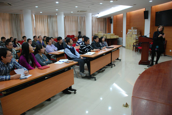 访问期间,K. Smalla教授做了题为“Adaptation and diversification of bacterial communities to pesticide contaminants inon-farm biopurification systems via mobile genetic elements”和“Einblicke in das Genom des RhizoctoniasolaniAntagonisten Pseudomonas jessenii RU47”的学术报告。林敏研究员、徐玉泉博士、陆伟博士等师生与K. Smalla教授就中德农业科技合作课题的研究进展;病原菌抗性基因鉴定及多样性生态学分析;作物根际微生物群落水平结构与功能多样性的研究方法以及微生物活性物质的分离与鉴定等研究内容进行了深入的探讨和交流,双方确定将在湿地微生物生态及农业微生物病害的生物防控等领域加强合作研究。