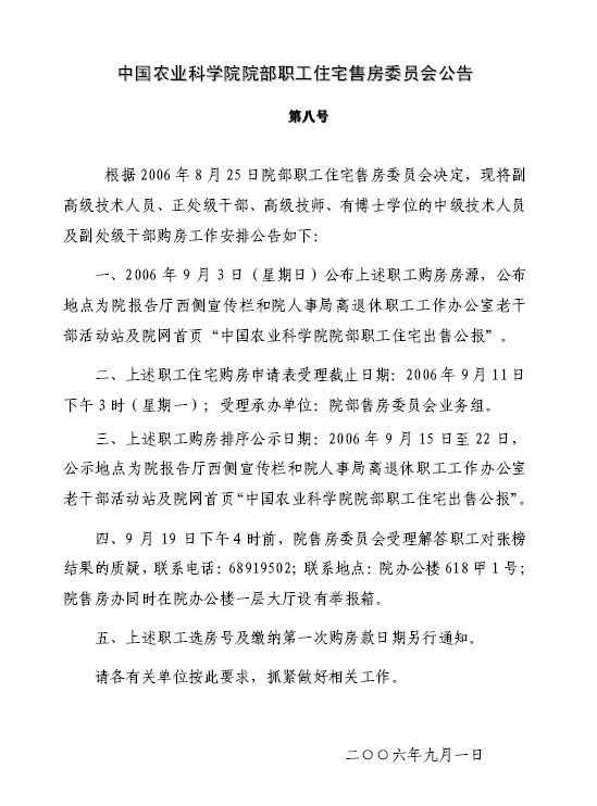 中国农业科学院院部职工住宅售房委员会公告(第八号)