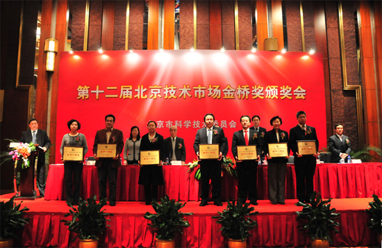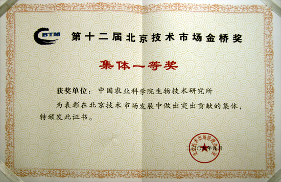 11月27日下午,第十二届北京技术市场金桥奖颁奖大会在北京国际饭店隆重举行。中国农业科学院生物技术研究所荣获第十二届北京技术市场金桥奖集体一等奖在大会上受到表彰。科技部火炬中心副主任蔡文沁、中国技术市场协会副会长刘东升、北京市人大教科文卫体委员会副主任孙军民、北京市科委主任闫傲霜、北京市审计局副局长张秋等领导出席大会并为2008年度北京技术市场发展做出突出贡献的集体、个人及优秀项目进行了颁奖。本届金桥奖共评审出46个先进集体、37个先进个人和32个优秀项目。