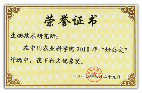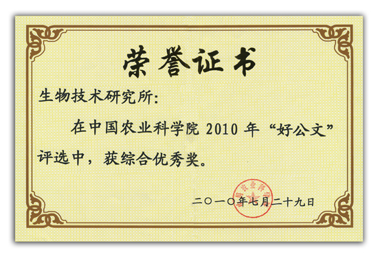 日前,我院举行了“2010年度好公文”评选,全院共推荐参评公文93份,我所在众多参选公文中脱颖而出,荣获综合优秀奖和下行文优秀奖,这是我所连续两次在院“好公文”评选中获得荣誉。我院2010年度综合政务会议在呼和浩特召开?;嵋槲竦?ldquo;2010年度好公文”综合优秀奖的10个单位、单项优秀奖的3个单位颁发了荣誉证书。所综合处处长孙丽萍出席了会议,并代表我所就公文处理工作在大会上进行了交流发言,为今后共同做好公文处理工作拓宽思路。