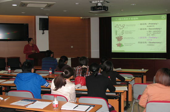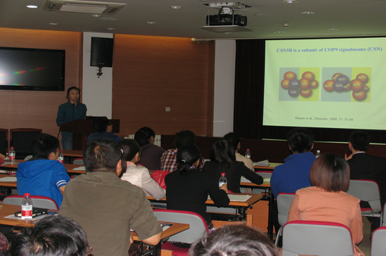 生物所2010级博士生王娟对其最近发表在《The Plant Cell》的Arabidopsis CSN5B Interacts with VTC1 and Modulates Ascorbic Acid Synthesis课题进行了报告,主要从研究背景,研究思路及技术流程方面作了介绍,阐明了CSN5B与VTC1的作用,并提出了该研究今后的方向。生物所2009级博士生,微生物酶工程研究室田健副研究员对分子模拟技术在分子生物学中的应用作了详细的讲解,主要从分子模拟技术在蛋白质功能、互作及定性方面分析,并结合具体的科研实例进行了精彩的报告。斯丹赛生物技术公司人员对新兴的TALEN基因敲除的产生背景、发展历程、及技术原理技术手段作了详细的介绍。