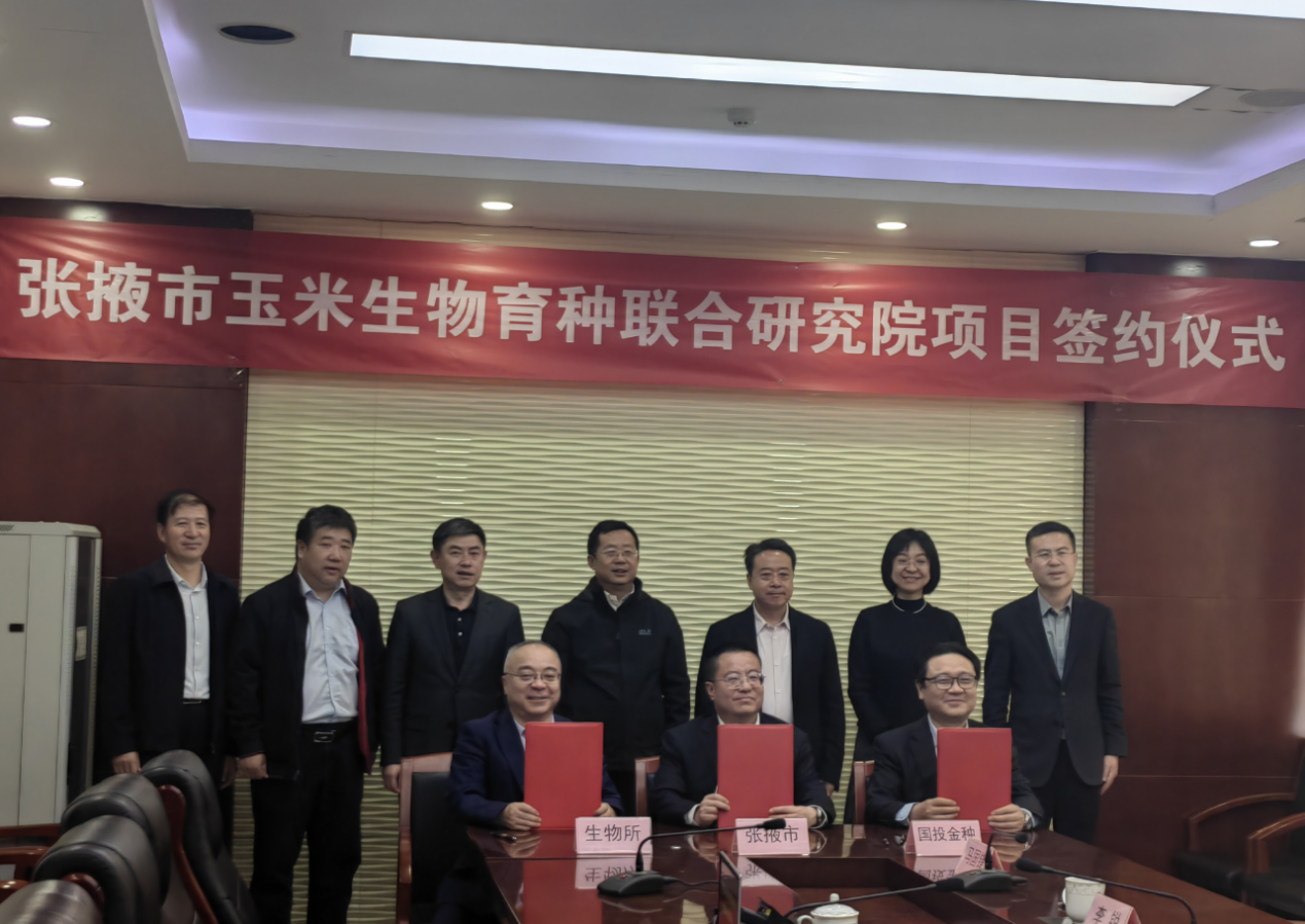 会见后,中国农科院副院长叶玉江、成果转化局副局长张熠等领导专家出席在生物所举办的联合研究院建设座谈会。生物所所长王登山详细介绍了生物所基本情况,张掖市副市长张力介绍张掖市种业发展及共建张掖市玉米生物育种联合研究院工作进展。卢小亨充分肯定了生物所在生物育种领域的创新成就以及联合研究院前期筹备工作效率,并建议双方以联合研究院为基础载体,进一步强化在种子认证平台、高端学术论坛等领域建设发展。中国农科院副院长叶玉江在总结讲话中指出要以此次合作为契机,整合现代生物技术与当地制种资源,完善“品种研发—检测认证—示范推广”全链条创新体系,期待通过合作充分发挥生物所的科研优势,助力张掖市农业科技创新和产业高质量发展?;崽缸詈?,张掖市、国投种业、生物所三方签署《张掖市玉米生物育种联合研究院项目合作协议》,标志着三方在玉米生物育种领域的深度合作正式启动,生物所将围绕种业科技创新、成果转化、人才培养等展开全方位协作,助力张掖市从“制种大市”向“种业强市”转型升级,为保障国家粮食安全、推动乡村振兴提供强劲科技支撑。