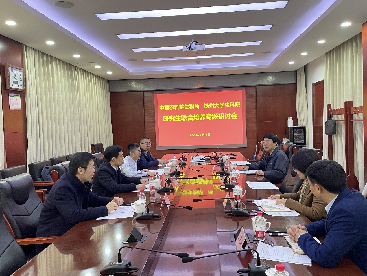 3月3日,扬州大学生科院党委书记陆江峰、院长黄金林一行到生物所交流合作,签署联合培养研究生协议。生物所所长李新海、副所长路铁刚、作物功能基因组研究中心主任陈茹梅、农业微生物学研究中心主任燕永亮等参加会议。