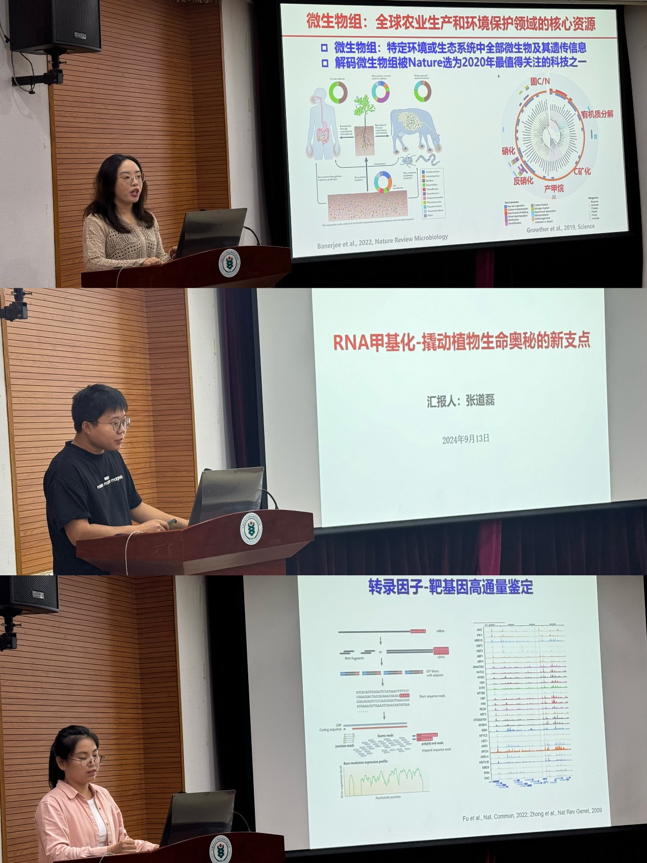 本次分享会邀请资划所张美玲博士和我所的两位博士生一起分享自己的科研感悟。张美玲博士围绕“农田秸秆分解微生物组的演替与功能解析”进行了精彩的演讲,不仅分享了最新的研究成果,还提出了未来研究的可能方向。生物所2022级博士生张道磊以“RNA甲基化-撬动植物生命奥秘的新支点”为题,详细讲解了RNA甲基化功能研究进展,同时也分享了关于广泛阅读专业领域文献的科学研究心得。最后,生物所2022级博士生周琪介绍了一种新型验证植物转录因子和下游靶基因互作的方法:SRS系统,为植物转录因子功能研究提供了新方法。