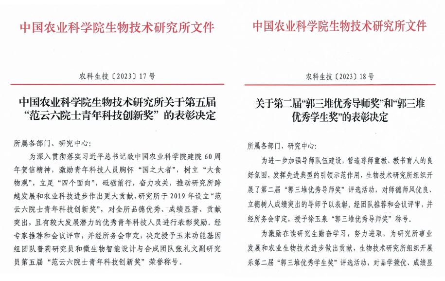 经专家推荐和会议评审,并经所务会审定,决定授予玉米功能基因组团队普莉研究员和微生物智能设计与合成团队张礼文副研究员“范云六院士青年科技创新奖”荣誉称号;授予微生物智能设计与合成团队徐玉泉研究员“郭三堆优秀导师奖”荣誉称号;授予丁尊丹、张道磊、叶育璐和刘璐4位研究生“郭三堆优秀学生奖”荣誉称号。