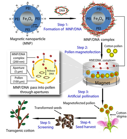 遗传转化是作物功能基因组研究和分子育种的核心工作。棉花因受体材料范围狭窄、组织培养再生周期长,遗传转化成为限制棉花分子生物学发展的主要瓶颈;发展转化周期短、无受体材料限制、转化效率高、安全的新型遗传转化技术,成为棉花科研工作者关注和研究的热点。此次研发的基于磁性纳米颗?;蛟靥宓幕ǚ鄞抛参镆糯奘畏椒?,可以利用Fe3O4磁性纳米颗粒负载含有外源基因DNA植物表达载体,在外加磁场介导下将外源基因表达载体输送至花粉内部,通过人工授粉利用自然生殖过程直接获得转基因种子,然后再经过选育获得稳定遗传的转基因后代。该方法将纳米磁转化和花粉管介导法相结合,克服了现有棉花主流转基因方法组织再生培养周期长、再生苗变异率高等方面的瓶颈问题,可以提高遗传转化效率、缩短转基因植物培育周期、实现高通量与多基因协同并转化,适用范围与用途非常广泛,对于加速转基因生物新品种培育具有重要意义,并在作物遗传学、合成生物学和生物反应器等领域也具有广泛应用前景。