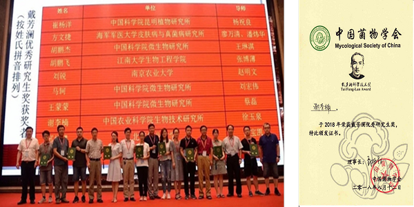 戴芳澜(1893 - 1973)是国际著名的真菌学家和植物病理学家,中央研究院院士,中国科学院院士,是中国菌物学的奠基人?!按鞣祭接判阊芯可薄保═ai Fung-Lan Award for Outstanding Graduate Student)是为了鼓励优秀研究生勇于创新、扎实工作,不断提高菌物学后备力量的研究水平而设立的,面向国内在校研究生自由申报,每年评选一次,由中国菌物学会结合学术年会组织专家进行评审与答辩产生。中国菌物学会2018年学术年会于8月10日至12日在山东省泰安市召开,同期进行2018年度戴芳澜优秀研究生奖评选工作,包括北京大学、浙江大学和中国科学院微生物所等全国知名高校和研究所的44名研究生申报了戴芳澜优秀研究生奖。经过现场答辩和专家的严格评选,共有包括谢李楠在内的9位研究生获此奖项,这也是我所第一位学生获此殊荣。