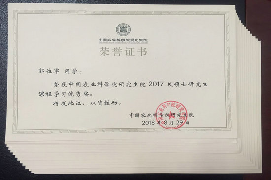 根据研究生院攻读博士、硕士学位专业培养方案的要求,及《中国农业科学院研究生院学生奖励条例》和《研究生中期考核暂行规定》有关规定,经研究生院对2016级、2017级研究生的政治思想、课程学习、科研能力、学位论文研究进展及在集体活动中的工作表现的全面考核,我所张宏扬等41名研究生荣膺2017-2018学年度“优秀学生干部”、“社会活动优秀奖”、“中期考核优秀生”、“课程学习优秀生”称号,并受到通报表彰。